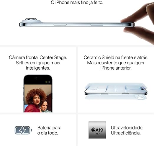 - MAIS RESISTENTE DO QUE QUALQUER IPHONE ANTERIOR — Estrutura em titânio ultraleve. O Ceramic Shield protege a parte de trás do iPhone Air, tornando‑o quatro vezes mais resistente ao choque. E o novo Ceramic Shield 2 à frente dá‑lhe o triplo da resistência a riscos.